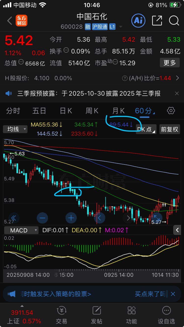 $中国石化(SH600028)$ 30分钟级别接近M型右侧最终顶部区域——明天中午再看届时股价回落到什么均线位置,以判断是否完成筑底
