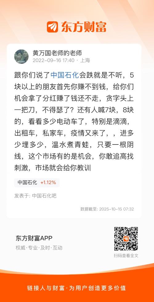 跟你们说了中国石化会跌就是不听,5块以上的朋友首先你赚不到钱,给你们机会拿了分红赚了钱还不走,贪字头上一把刀,不得瑟了?还有人喊7块,8块的,看看多少电动车了,特别是滴滴,出租车,私家车,疫情又来了,,进多少埋多少,温水煮青蛙,只要一根阴线,这个市场有的是机会,你敢追高找刺激,市场就会给你教训