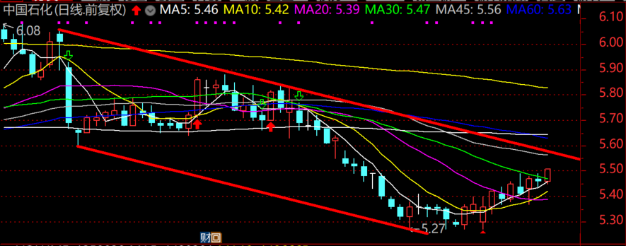 中国石化,日线、周线级别的K线看涨,月K线、45日K线、季度K线看跌,所以现在持股的可以继续持股,不卖出,持币的可以继续持币,不买入,都耐心等待各自的最佳的卖点和买点。