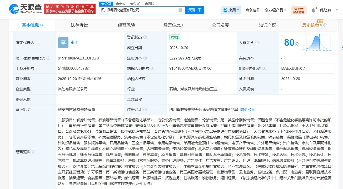 南方财经10月23日电,天眼查工商信息显示,近日,四川雅州石化能源有限公司成立,法定代表人为李平,注册资本约3228万人民币,经营范围含润滑油销售、石油制品销售、办公设备销售、电池销售、轮胎销售、电动汽车充电基础设施运营、集中式快速充电站、普通货物仓储服务等。股东信息显示,该公司由四川雅州新区物流园区发展有限责任公司、中国石化销售股份有限公司共同持股。