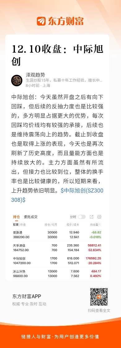 中际旭创:今天虽然开盘之后有向下回踩,但后续的反抽力度也是比较强的,多方明显占据更大的优势,每次回踩均价线均有较强的承接,后续也是维持震荡向上的趋势。截止到收盘也是取得上涨的表现,今天也是再次刷新了历史高度,而且量能方面也是持续放大的。主力方面虽然有所流出,但接力也比较到位,整体的换手率也是比较健康的,所以短期来看,上升趋势依旧明显。$中际旭创(SZ300308)$