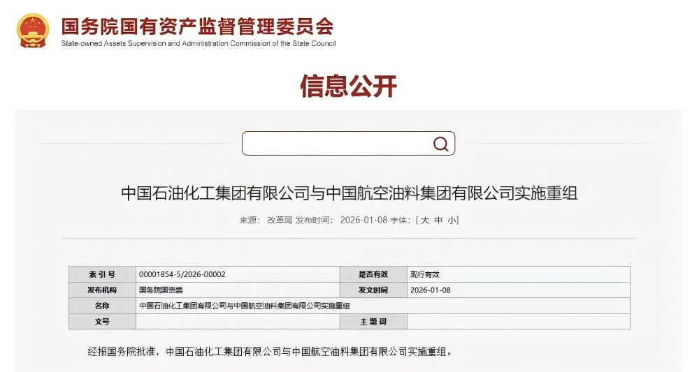 1月8日,国务院国资委网站信息显示,经报国务院批准,中国石油化工集团有限公司(以下简称“中国石化”)与中国航空油料集团有限公司(以下简称“中国航油”)实施重组。