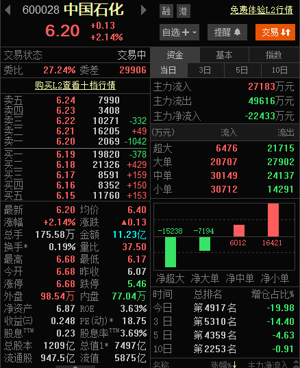 中国石化集合竞价涨停!开盘股价跳水,涨幅回落至2%