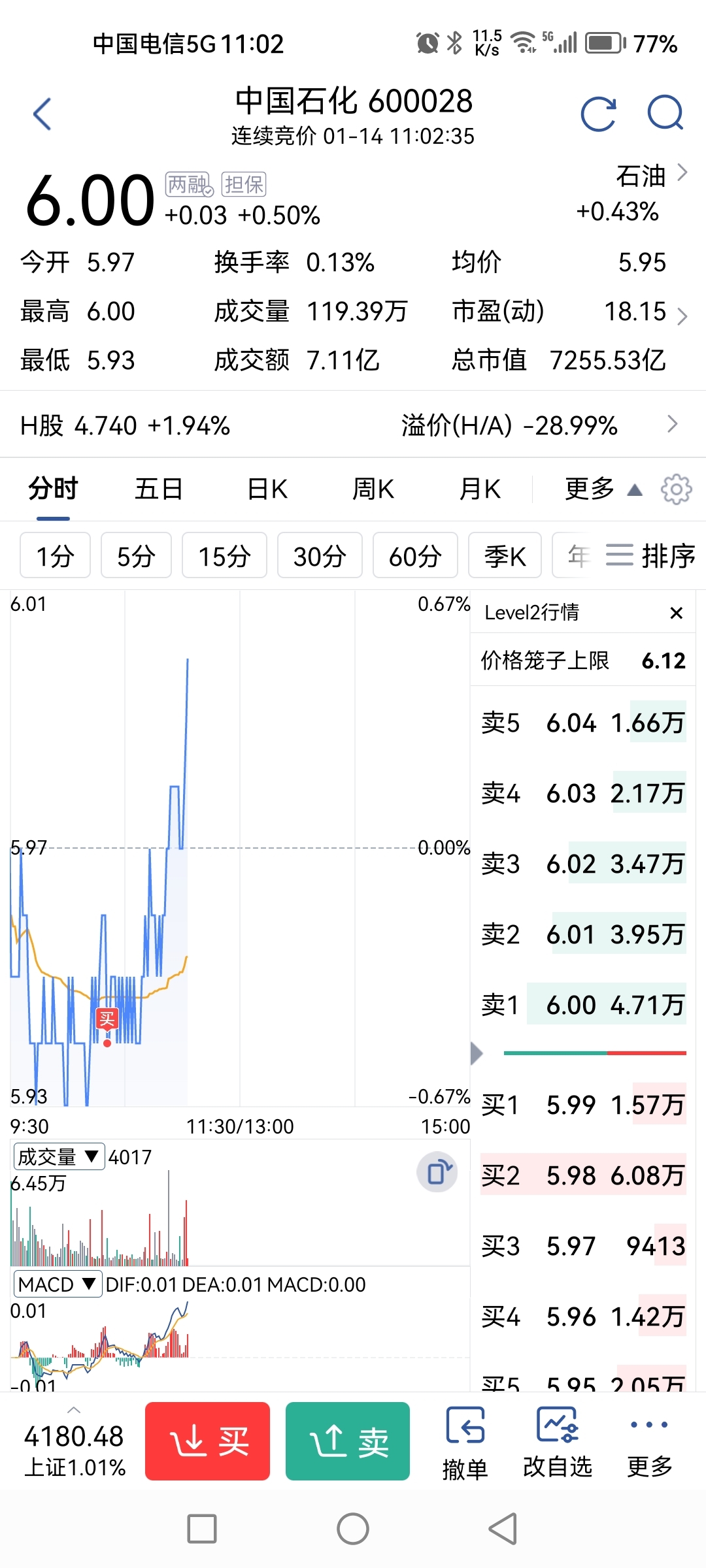 $中国石化(SH600028)$ 主力,能拉个涨停么?