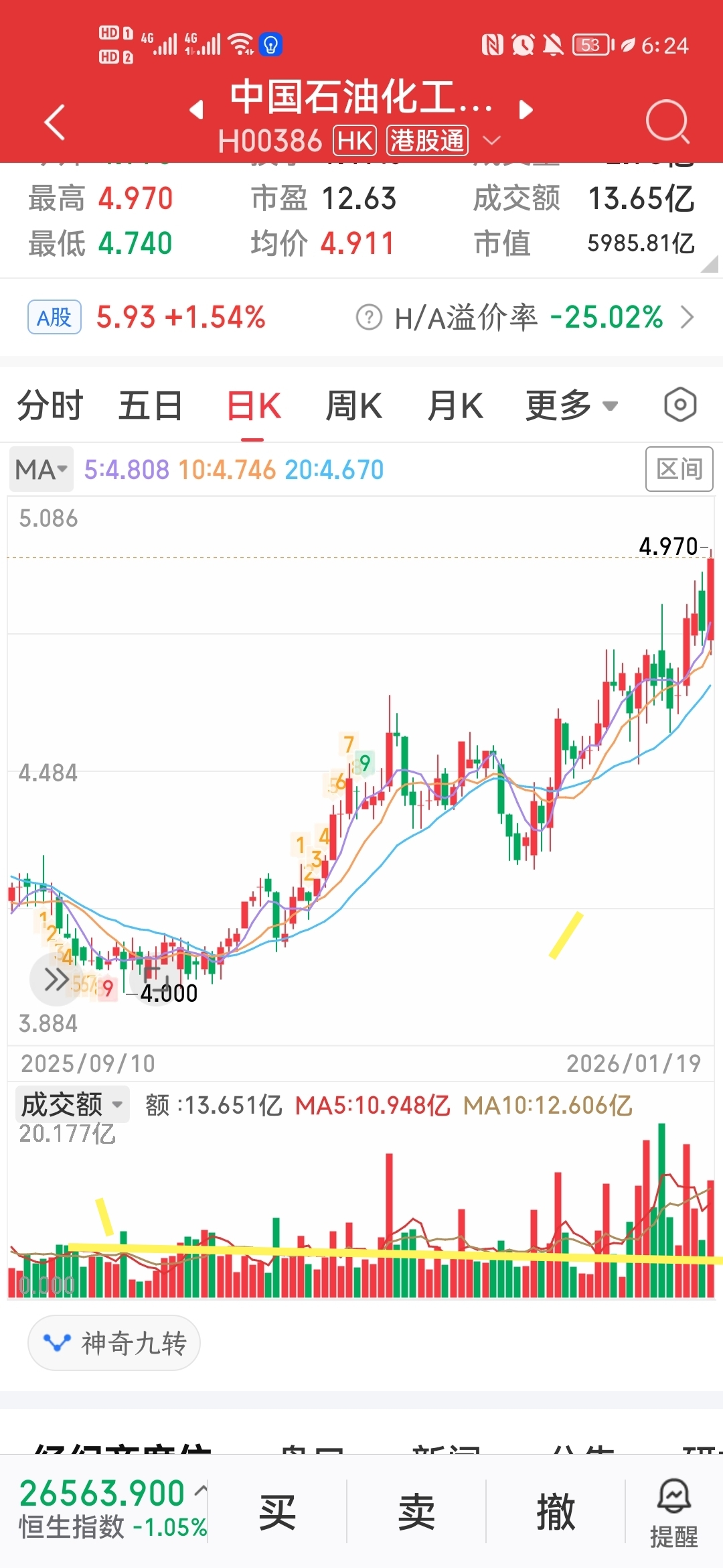 $中国石化(SH600028)$ 港股中石化底部量能明显放大,有进一步拉升的潜力,25年中石油涨幅明显,但中石化却滞后,26年肯定补涨回来,港股中石化,中石油涨幅明显高于A股,但是A股最后都有表现,2026希望更好,更多耐心,加油