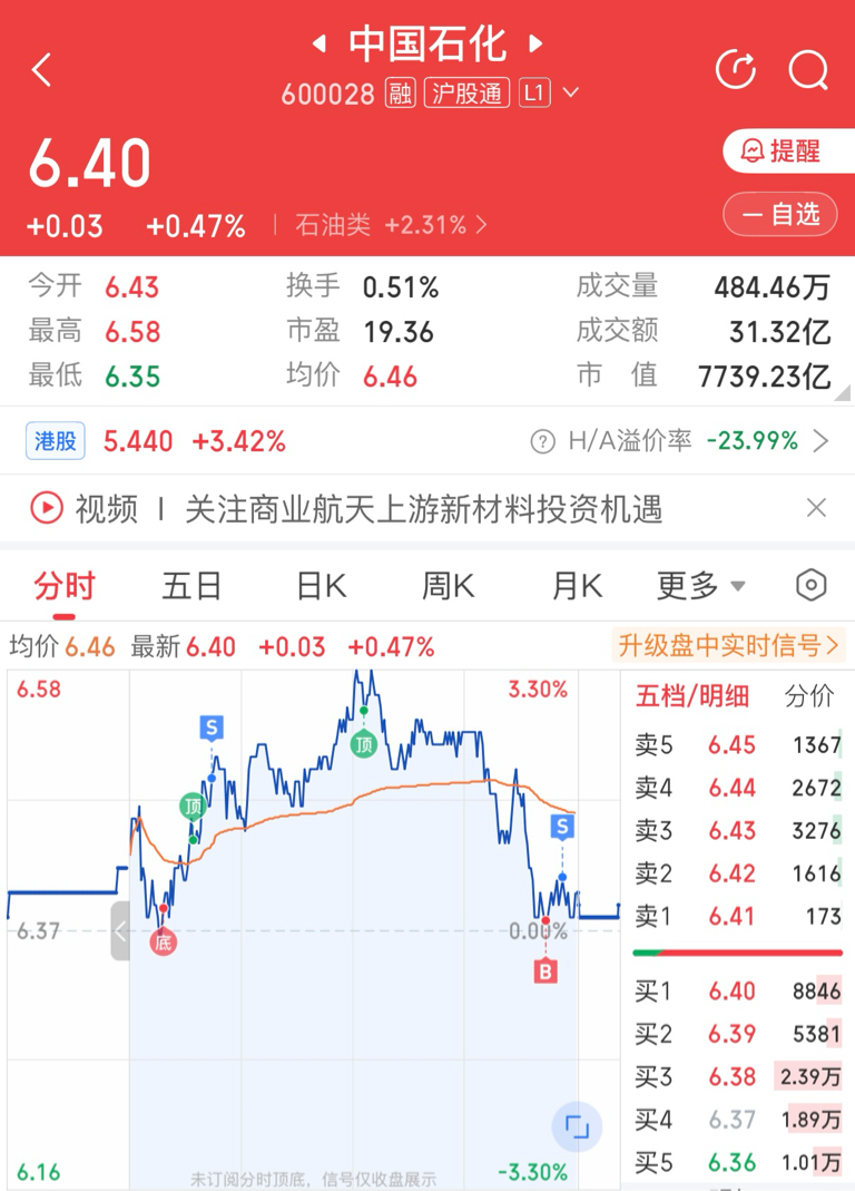 $中国石化(SH600028)$ 昨天高点 6.50 未及卖出,今天卖出了就是可惜卖早了,尾盘 6.37 接回来、再次 6.41 又 T 出去了。今日小赚。