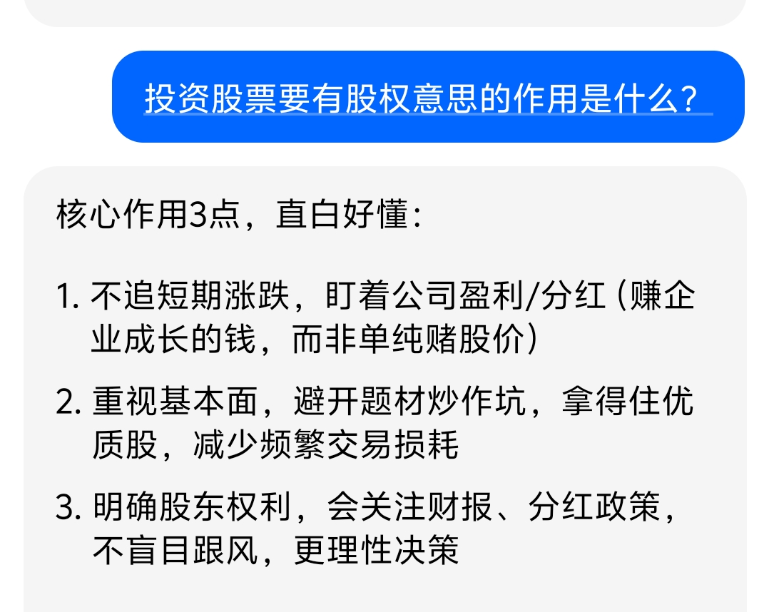 有了股权意思:就不会象暮年老头那样中国石化16.8元买入目前价格想要全仓T出!执着的攒股跑偏门一样还是没有股权意思!在长线价值投资的道路上摇摇摆摆!祝大家都能开开心心玩股票!共同富裕大家好才是真的好!