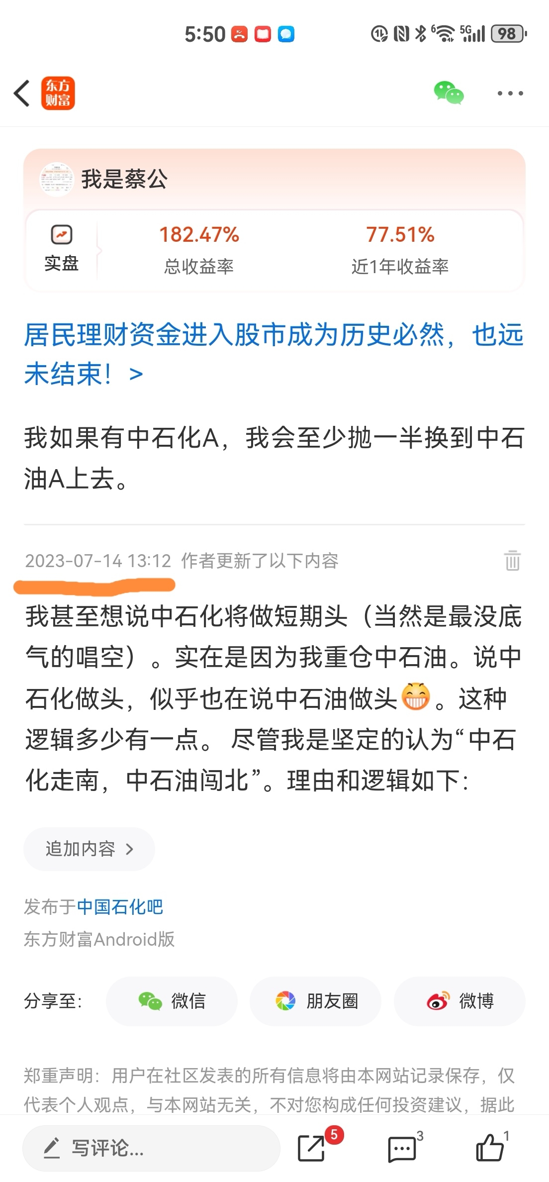 $中国石化(SH600028)$ 曾经中石化A股价高过中石油A。曾经中石化H股价更是远高于中石油H。是三年前哦。我有提醒哦。如今,中石油AH双双远远远远远高于中石化AH了。看看墓年老头那段话,你有何感想?