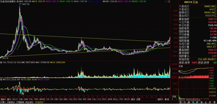 在“三桶油”的带领下,通达信设计的石油指数飙升9.59%,创出了2008年3月以来的新高,报1662.23点。39家石油股中就有26家涨停,其中科力股份30%涨停,潜能恒信、通源石油等20%涨停。