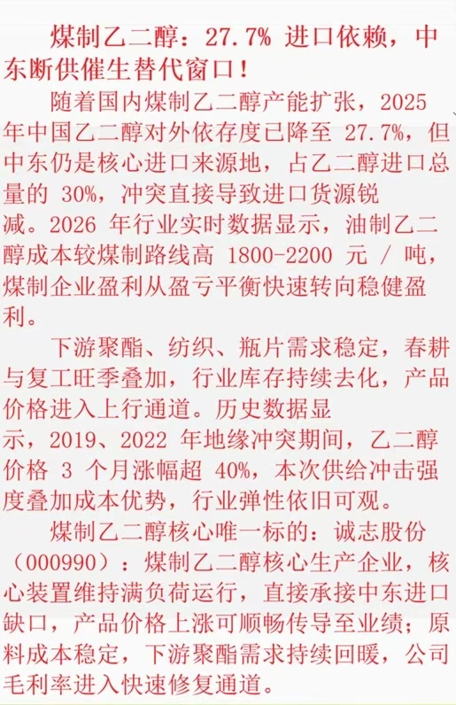 别只盯着石油化工油气开采,真正弹性大确定性高的是煤制烯烃、煤制乙二醇、煤制甲醇三大核心赛道!核心逻辑只有一个 ——油价上行放大成本剪刀差 中东供给缺口 国产替代刚性需求:中东是全球原油、甲醇、乙二醇核心出口区,冲突直接导致伊朗等国石化产品出口中断,中国甲醇进口中45%-60% 来自伊朗,乙二醇对外依存度已降至 27.7% 但中东货源仍占进口总量 30%,供给缺口快速扩大;同时国际油价大涨,油制化工成本飙升,而国内煤价稳定在合理区间,油价 90 美元 / 桶时,煤制路线较油制路线单吨成本差扩大至 1500-2000 元,利润空间被彻底打开。判断标的弹性的核心标准:煤炭自给率越高、煤制一体化程度越高、对外依存度越高的品类,涨价弹性越大,业绩增厚越确定。核心受益品类:下面这 3 个品类成最大赢家!1. 煤制烯烃:成本差超 1500 元 / 吨,弹性全行业第一!数据显示,2025 年中国煤制烯烃总产能突破 2000 万吨 / 年,占全国烯烃总产能近 20%。当油价突破 90 美元 / 桶时,油制与煤制单吨成本差超 1500 元,盈利差距持续拉大。@妙想 2. 煤制乙二醇:27.7% 进口依赖,中东断供催生替代窗口!随着国内煤制乙二醇产能扩张,2025 年中国乙二醇对外依存度已降至 27.7%,但中东仍是核心进口来源地,占乙二醇进口总量的 30%,冲突直接导致进口货源锐减。2026 年行业实时数据显示,油制乙二醇成本较煤制路线高 1800-2200 元 / 吨,煤制企业盈利从盈亏平衡快速转向稳健盈利。下游需求稳定,春耕与复工旺季叠加,行业库存持续去化,产品价格进入上行通道。2019、2022 年地缘冲突期间,乙二醇价格3个月涨幅超 40%!3. 煤制甲醇:45% 进口来自伊朗,供给缺口已成定局!伊朗是全球甲醇第一大出口国,占中国甲醇进口量的45%-60%。煤制甲醇成本仅1800-2200 元 / 吨,远低于天然气制甲醇与进口货源,既是基础化工原料,又是煤制烯烃的核心中间品,上游自给 下游自用的一体化企业,直接享受量价齐升的双重红利。$中国石化(SH600028)$$中国石油(SH601857)$$宝丰能源(SH600989)$