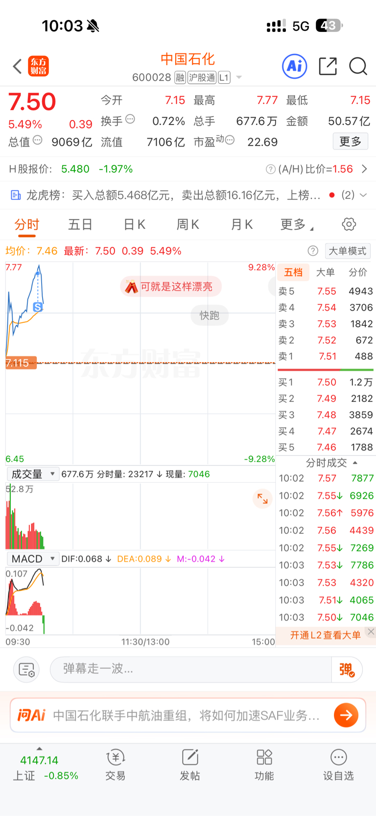 $中国石化(SH600028)$ 吃了八个点走了