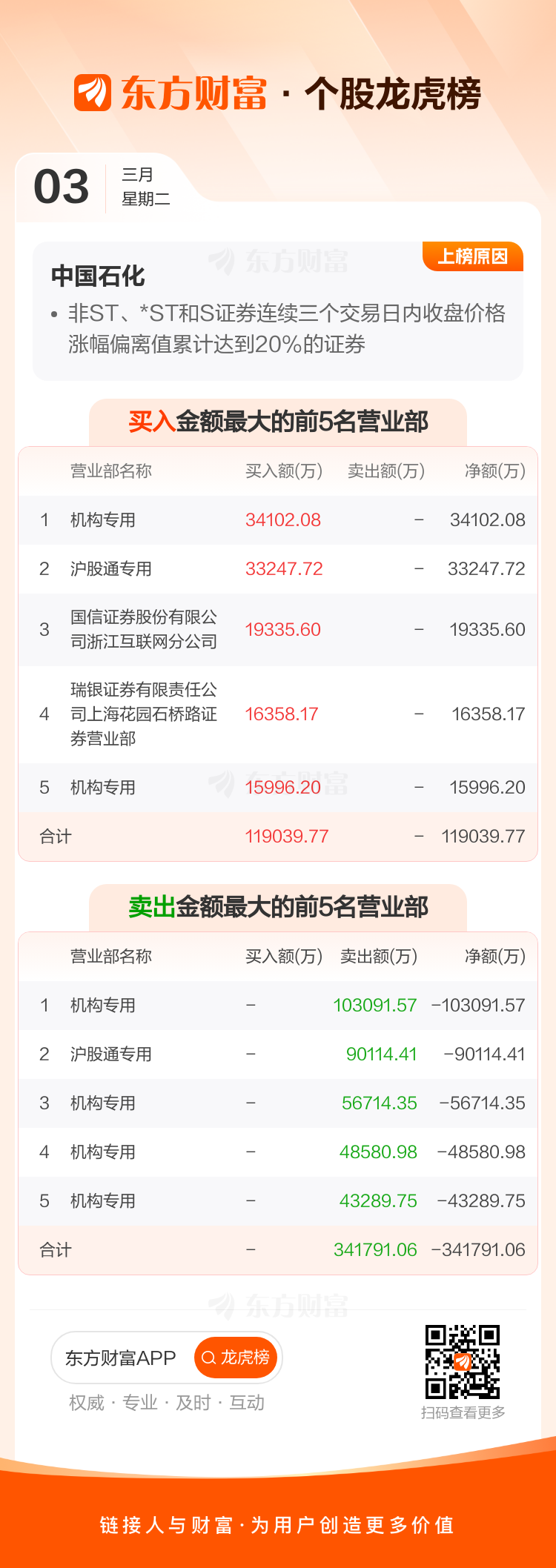 交易所2026年3月3日公布的交易公开信息显示,中国石化因成为非ST、*ST和S证券连续三个交易日内收盘价格涨幅偏离值累计达到20%的证券上榜。中国石化当日收报7.82元,涨跌幅9.99%,换手率1.59%,成交额114.27亿。异常期间3月2日至3月3日,期间涨幅21.05%,累计偏离值22.01%,区间成交额188.57亿。