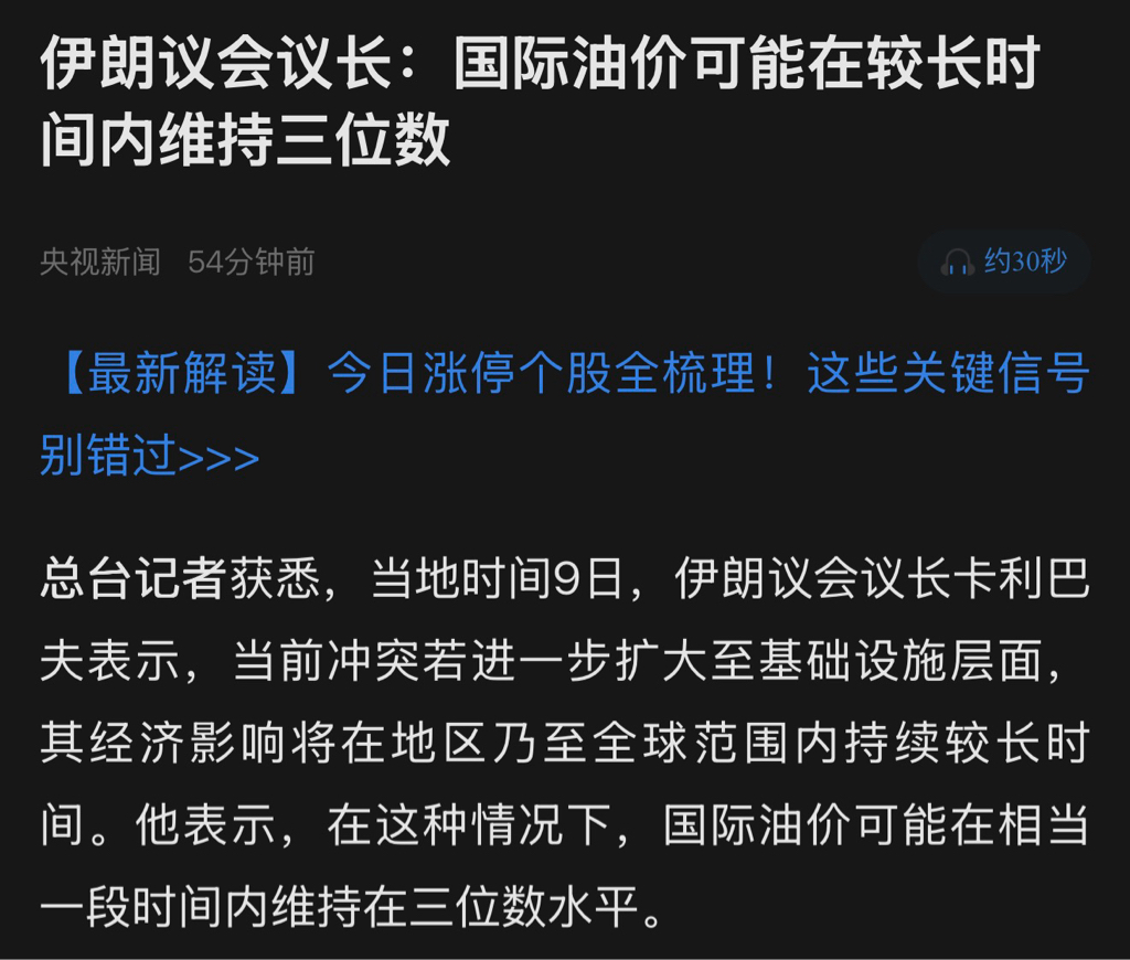 $中国石化(SH600028)$ 当地时间9日,伊朗议会议长卡利巴夫表示,当前冲突若进一步扩大至基础设施层面,其经济影响将在地区乃至全球范围内持续较长时间。他表示,在这种情况下,国际油价可能在相当一段时间内维持在三位数水平。