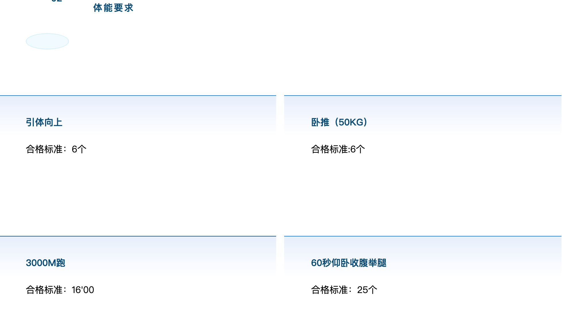 在体能要求方面,引体向上的合格标准为6个,卧推(50KG)的合格标准为6个,3000米跑的合格标准为16'00,60秒仰卧收腹举腿的合格标准为25个。