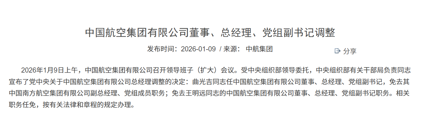 中航集团官网1月9日发布公告称,原中国南方航空集团有限公司(简称“南航”)副总经理、党组成员曲光吉出任中国航空集团有限公司(简称“中航”)董事、总经理、党组副书记。