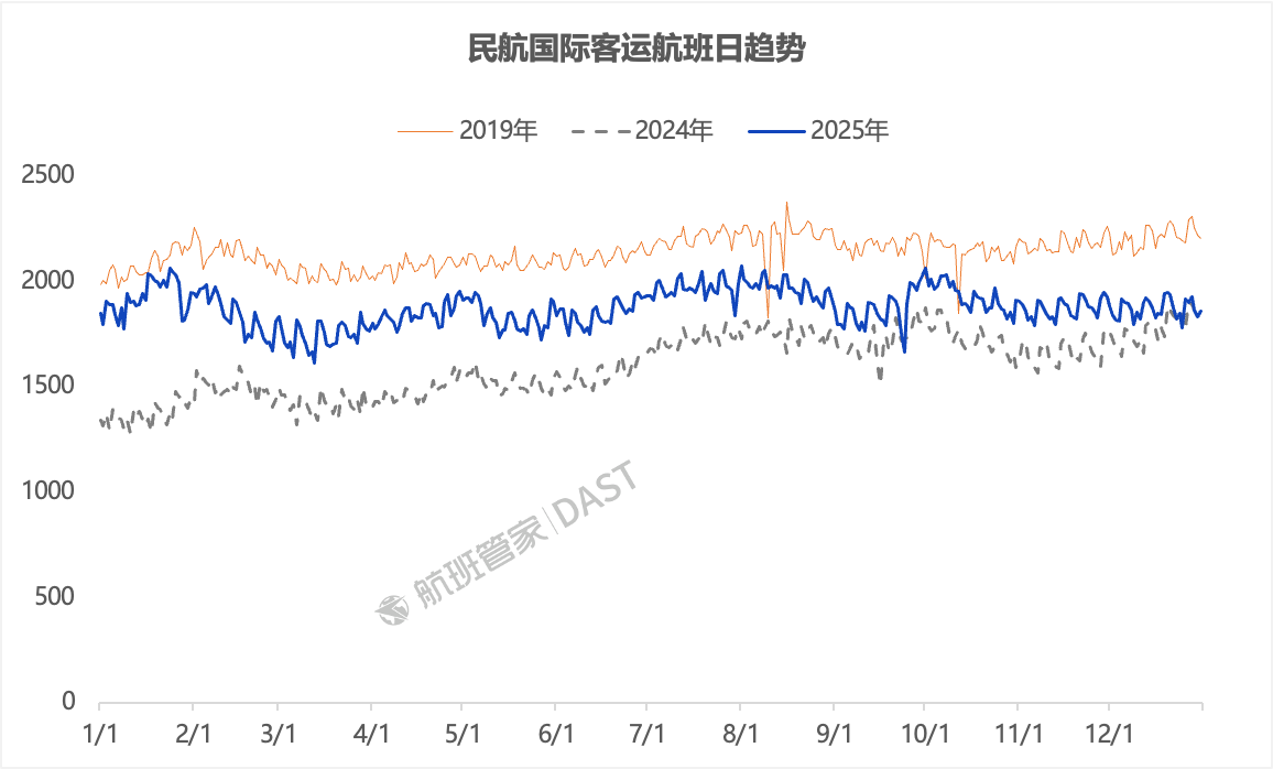 国际客运航班2019、2024及2025年日趋势对比图(图片来源:航班管家)