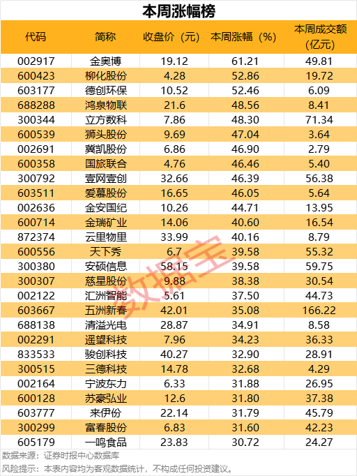 金奥博收获七连板,本周涨幅61.21%,居周涨幅之首,周成交额环比放量近6倍;柳化股份今日上演“地天板”,收盘涨停,本周5个交易日内有4天涨停,周涨幅为52.86%,周成交额19.7亿元,环比上周放量超11倍,德创环保周涨幅为52.46%,本周成交额环比增长4倍。