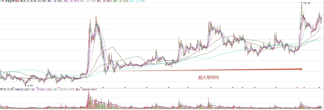 中信证券,周线级别的走势来看,构筑了一个超大型的中枢结构,这个结构在去年九月底的