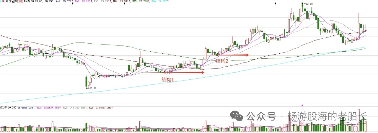 中信证券,今天小幅度上涨,基本符合预期。不过,今天没有冲上去,日K线上影线比较长,释放了调整信号。所以,下周初股价大概率有调整。不过,节前的大阳线,确认的低点依然是有效的。也就是说,接下来的调整,大概率在节前的低点上方震荡。图中标注的结构1突破,意味着股价处在上涨趋势。结构2是结构1突破后的回踩,意味着后期有波段上涨。