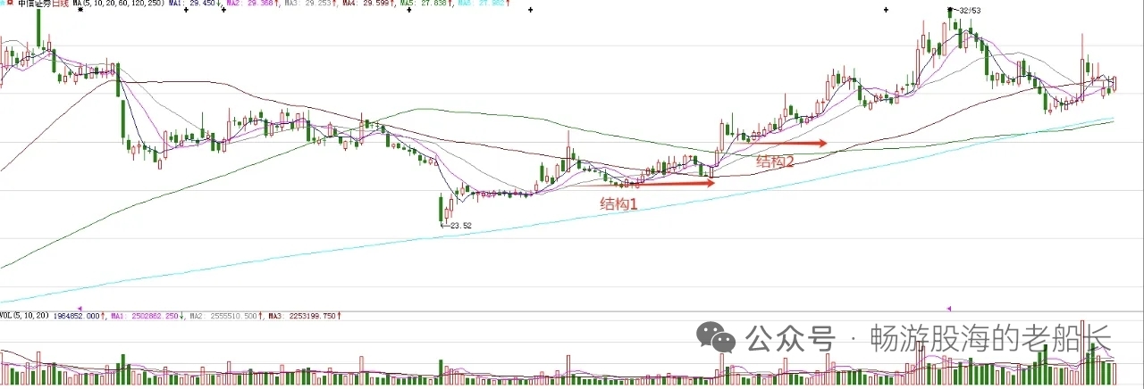 中信证券,今天走出小阳线,意味着周四股价还有上冲,但是上涨的幅度不太好确定。即便是突破不成功,接下来一段时间,也是在年线上方震荡。图中标注的结构1突破,意味着股价处在上涨趋势。结构2是结构1突破后的回踩,意味着后期还有波段上涨。