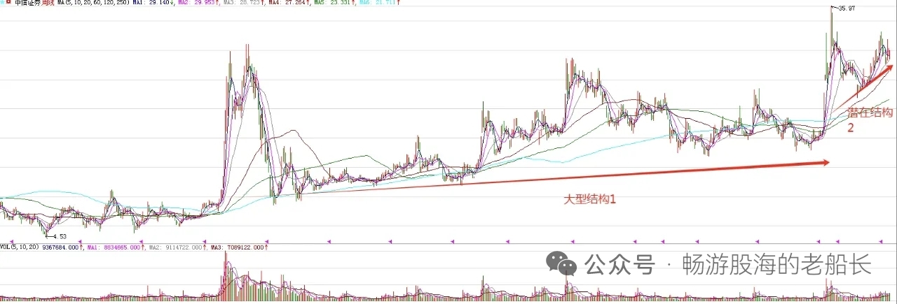 中信证券,周线级别的走势来看,最近一段时间,股价处在调整过程,这是符合此前预期的。且处在比较大的调整周期,如图所示,大概率在构筑一个比较大的潜在中枢结构2,作为结构1突破后的回踩。图中标注的超大型中枢结构突破,意味着股价处在超大级别的上涨周期,后期有比较大的上涨空间。但是,大型结构突破后,通常有较长时间的调整。接下来一段时间,股价大概率在28以上震荡调整。