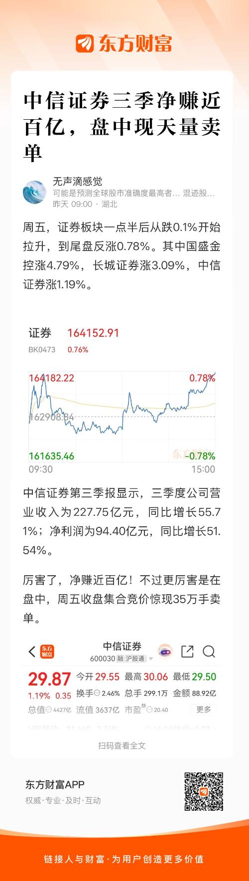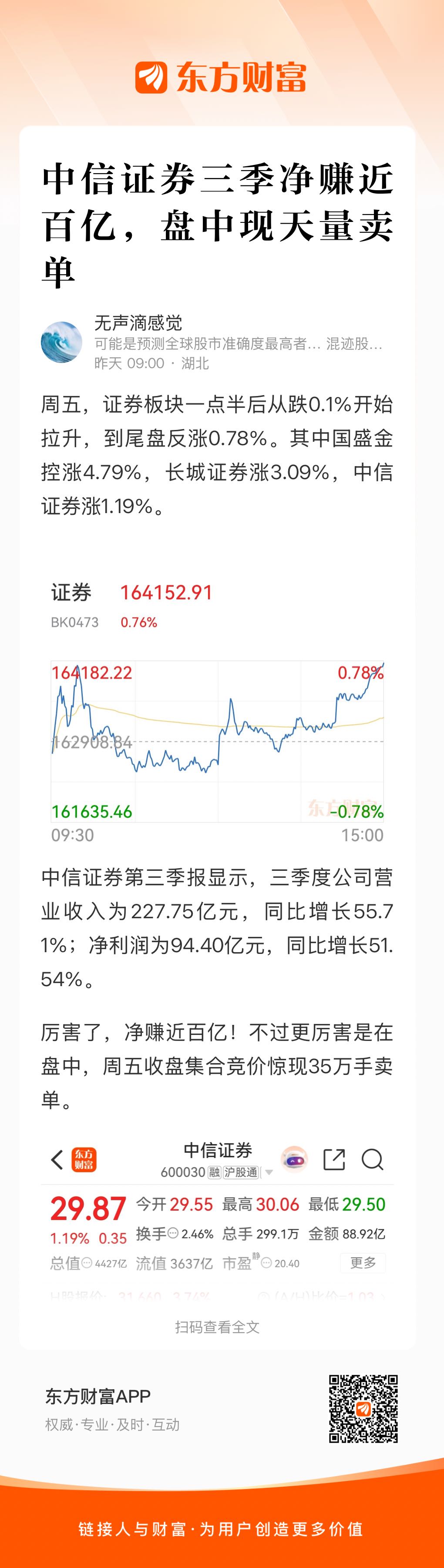 中信证券第三季报显示,三季度公司营业收入为227.75亿元,同比增长55.71%;净利润为94.40亿元,同比增长51.54%。