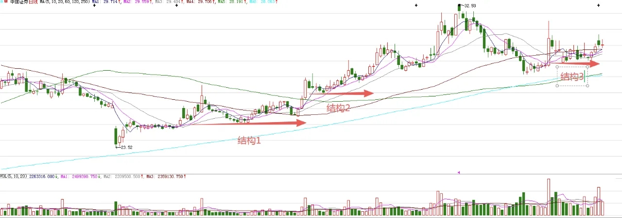 今天走出十字星,释放了企稳信号。在昨天的分析中,已经指出了昨天的K线,虽然看着不够强势,但是却实现了结构3的有效突破。今天的十字星,是结构3突破后的回踩,回踩到位了。图中标注的结构1突破,意味着股价处在上涨趋势。结构2是结构1突破后的回踩,意味着后期有波段上涨。结构3的突破,意味着中期调整结束,波段上涨即将拉开帷幕。