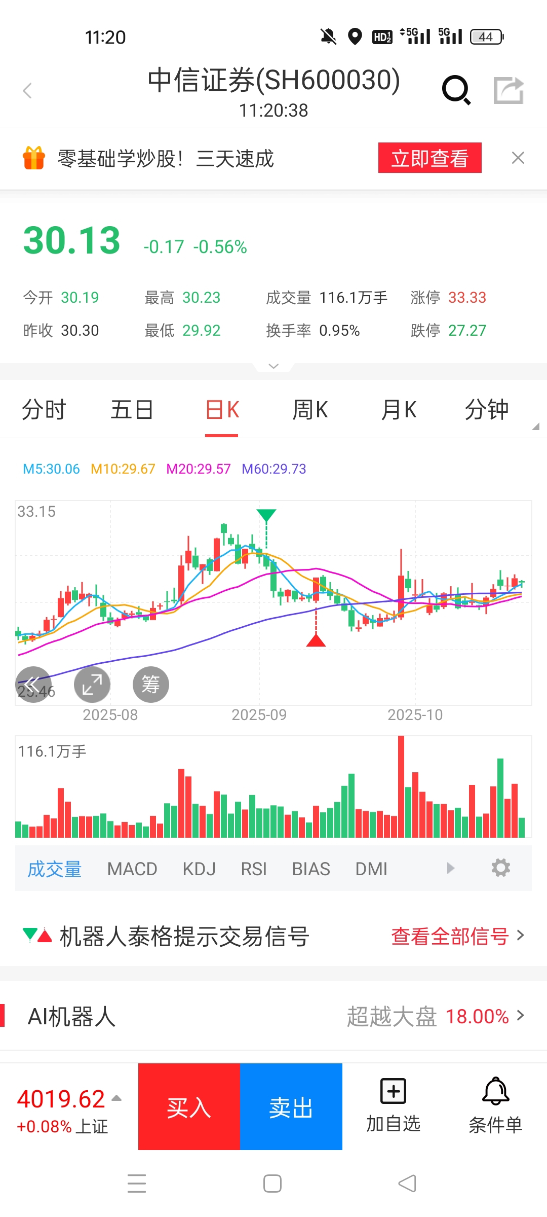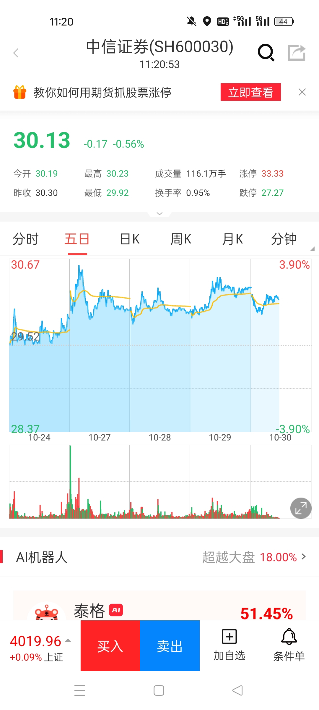 中信证券这波震荡看得人有点纠结!今天30.13元小跌0.56%,最近几天在30左
