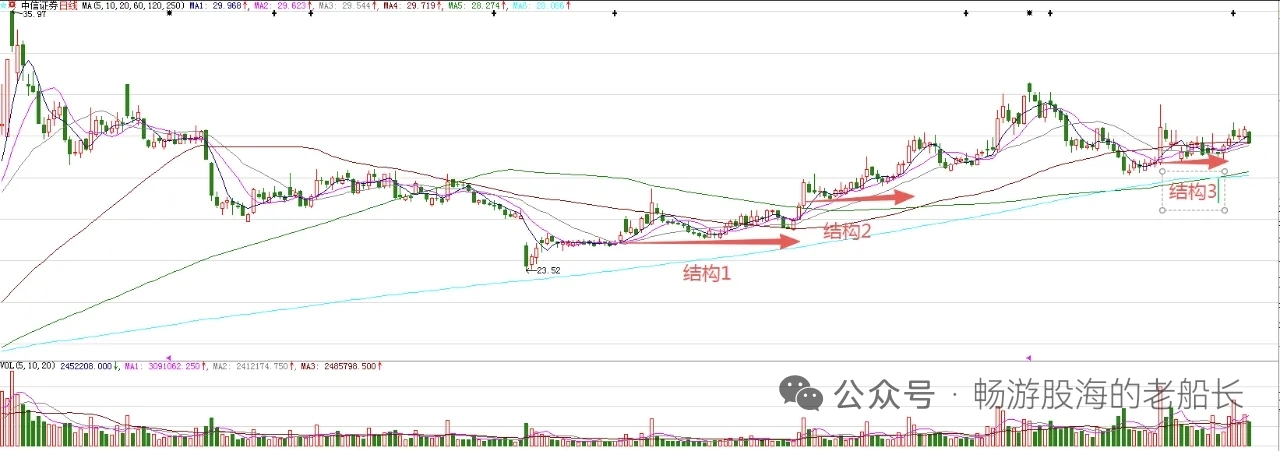 图中标注的结构1突破,意味着股价处在上涨趋势。结构2是结构1突破后的回踩,意味着后期有波段上涨。结构3突破,意味着波段上涨不远了。
