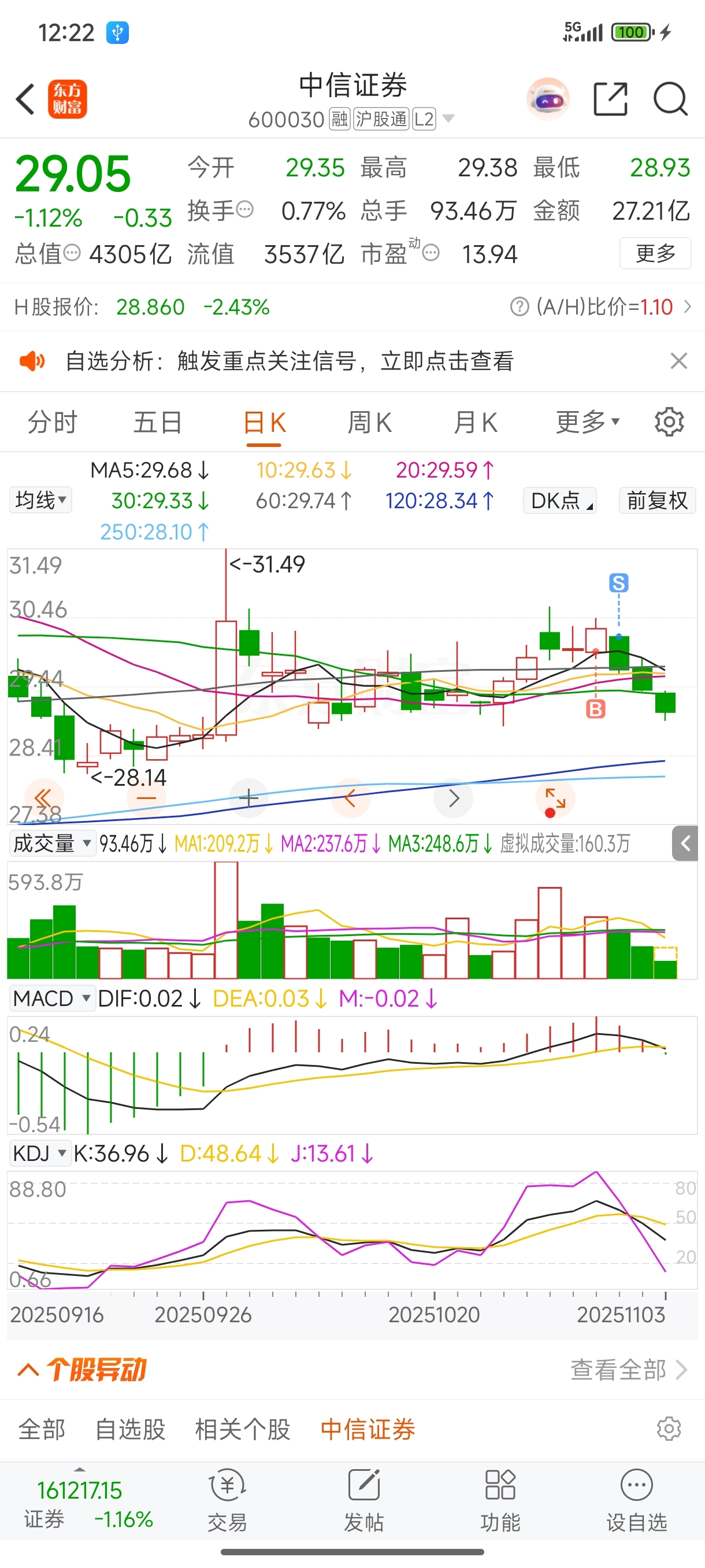 $中信证券(SH600030)$ 下午再跌多一个点我就买回来。绝对不相信券商板块只跌不涨。