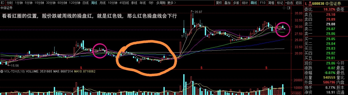大家看看看看红圈的位置,股价跌破周线的操盘红,就是红色钱,那么红色操盘线会下行。