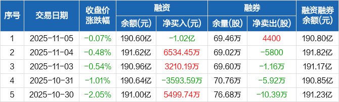 中信证券:融资净偿还1.02亿元,融资余额190.6亿元(11-05)