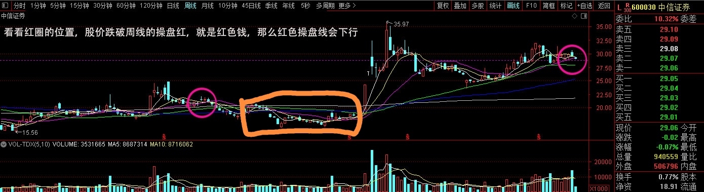 为什么中信证券股价不能破绿色周线,因为股价破了绿色线,红色操盘线为下穿绿色线。那么就是红色操盘线下行,并且股价在操盘线下方啊!