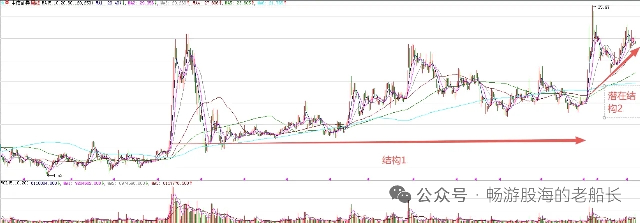 周线级别的走势来看,存在超大型的中枢结构1,这个结构规模之大,足以推动股价后期走