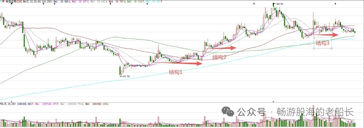 $中信证券(SH600030)$ 基本符合预期。短线来看,明天还有下探。但是,股价已经到了结构3的下轨,也到了半年线和年线附近,这里结束调整是大概率事件,调整的空间到了,只差点时间周期。图中标注的结构1突破,意味着股价处在上涨趋势。结构2是结构1突破后的回踩,意味着后期有波段上涨。既然结构3突破了,就意味着波段上涨不远了。