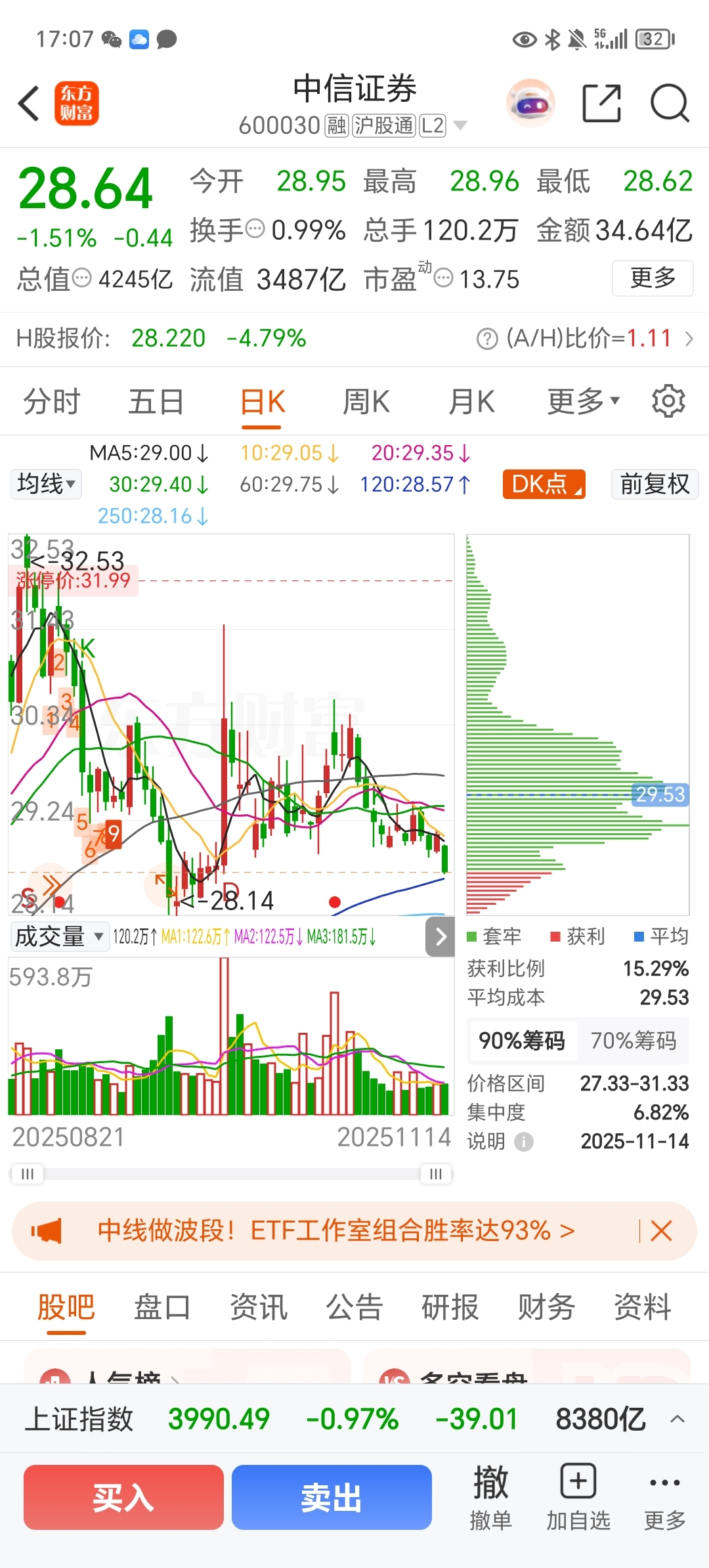 $中信证券(SH600030)$ 29.53不割肉,难涨哦