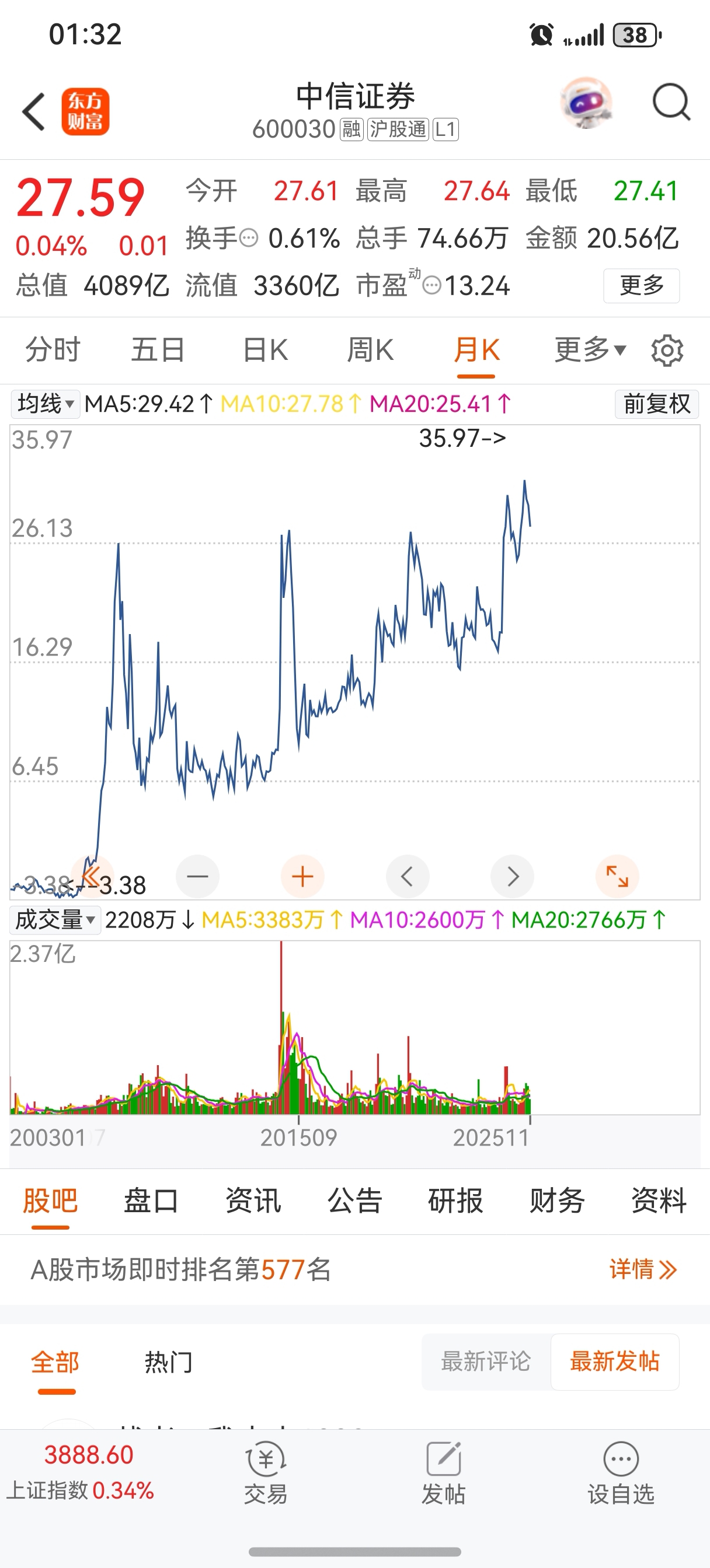 $中信证券(SH600030)$ 我是周五刚进来的仓位,目前盈利0.3%。看股吧里都抱怨没涨、我只想要短期反弹五个点走人。这都历史新高了,这样叫没涨?