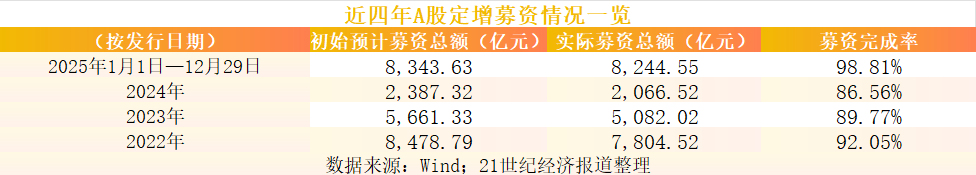 另一个值得关注的数据是募资完成率显著提高。截至12月29日,A股2025年以来定增募资完成率为98.81%,较2024年提升12.25个百分点。2022年至2024年全年,A股定增募资完成率分别为92.05%、89.77%和86.56%。