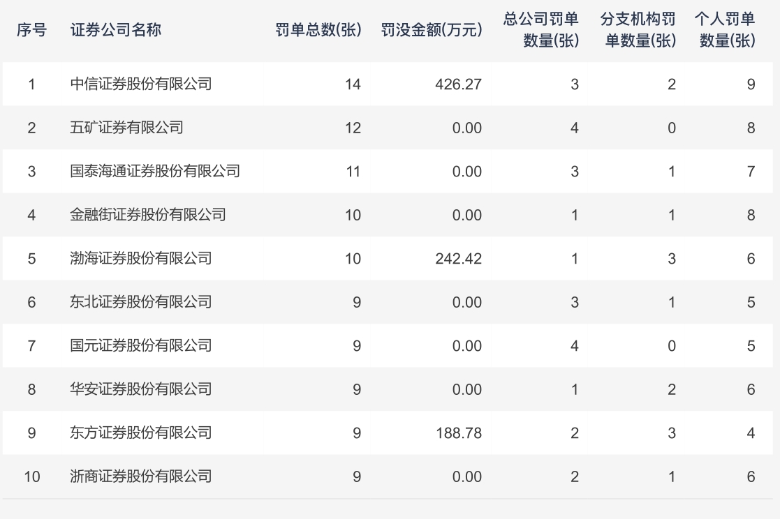 从券商罚单排名来看,中信证券受罚较多,一共收到了14张罚单,但罚没金额仅426.27万元;东海证券收到的罚单数量没排进前十,但一张6000万元罚单就使其成为2025年受罚最重的券商。