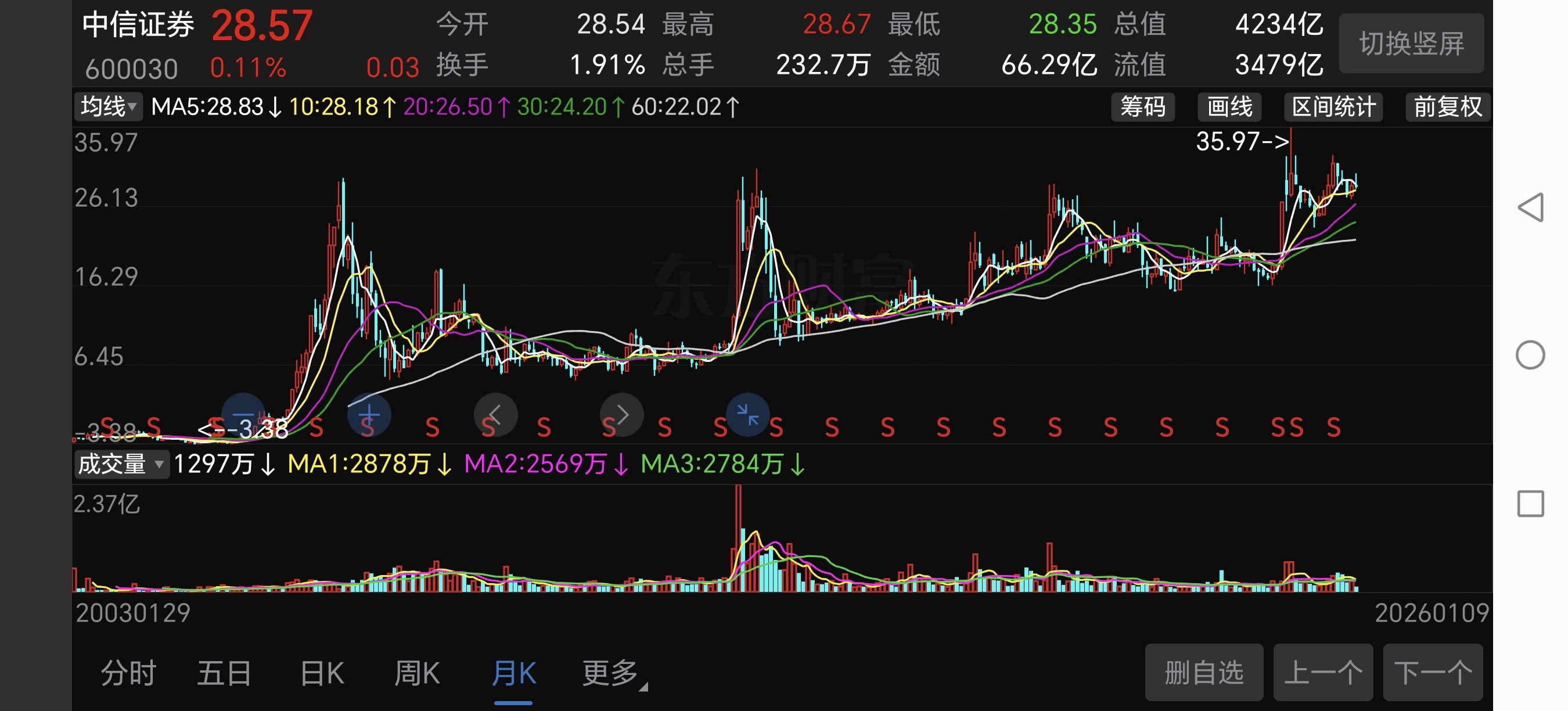 如果把中信月线图整个大浪型看做一只股票的日线图,4000点是新一轮主升的起点,这