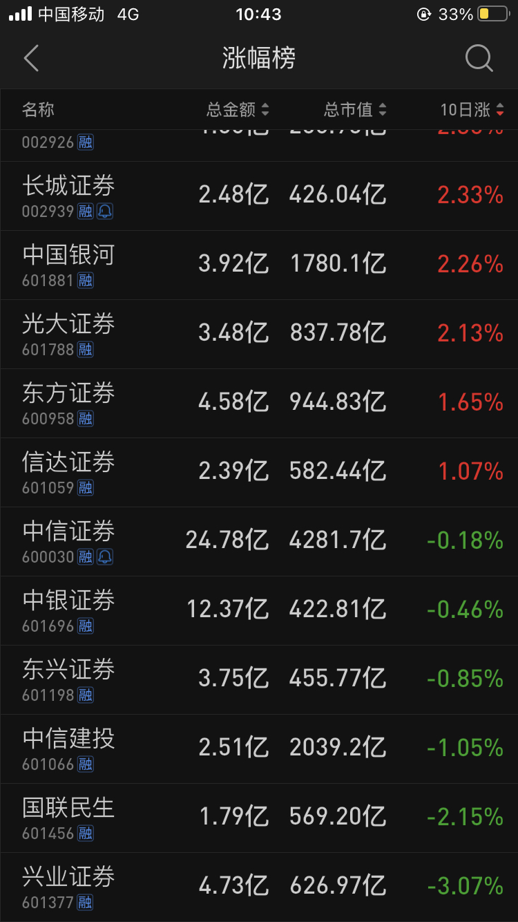 $中信证券(SH600030)$ 证券板块里面10日涨幅,还可以,中信只排倒数第6