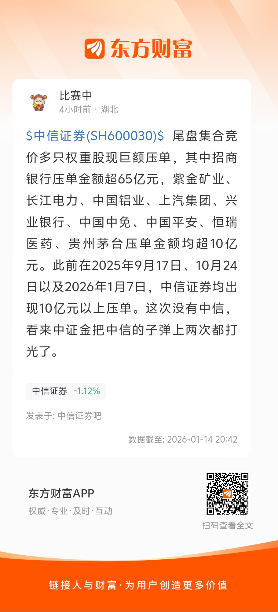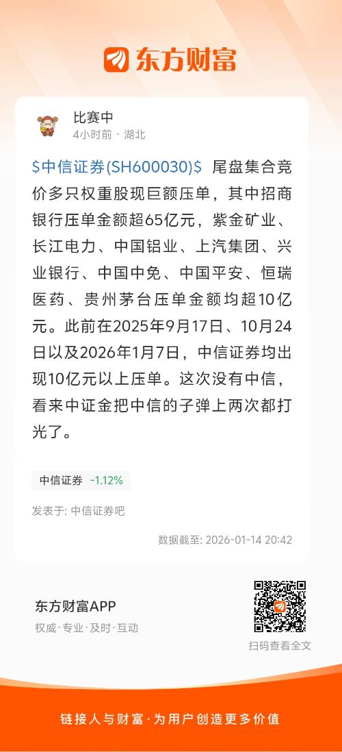 $中信证券(SH600030)$ 尾盘集合竞价多只权重股现巨额压单,其中招商银行压单金额超65亿元,紫金矿业、长江电力、中国铝业、上汽集团、兴业银行、中国中免、中国平安、恒瑞医药、贵州茅台压单金额均超10亿元。此前在2025年9月17日、10月24日以及2026年1月7日,中信证券均出现10亿元以上压单。这次没有中信,看来中证金把中信的子弹上两次都打光了。