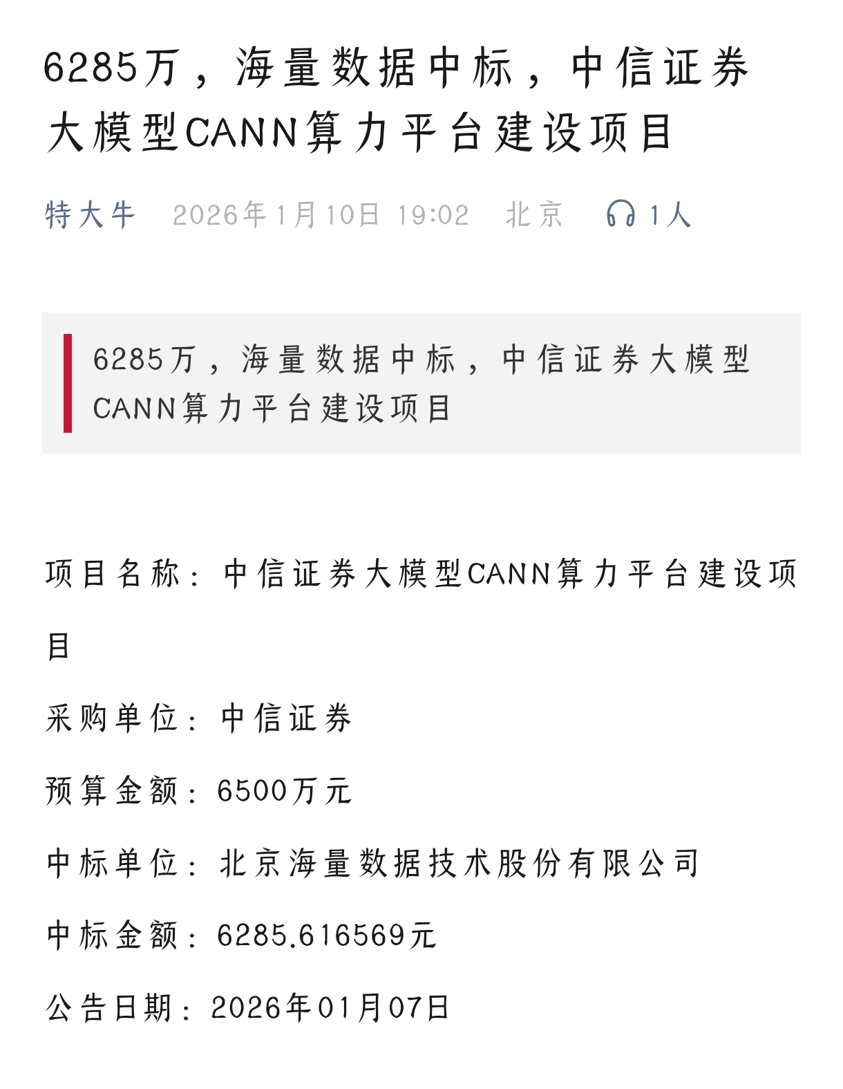 这次中标中信证券的大模型算力项目是海量数据的重大突破!!!证实海量数据在国产数据库、AI大模型、向量数据库等方面的核心实力!!!$中信证券(SH600030)$$星环科技-U(SH688031)$$海量数据(SH603138)$