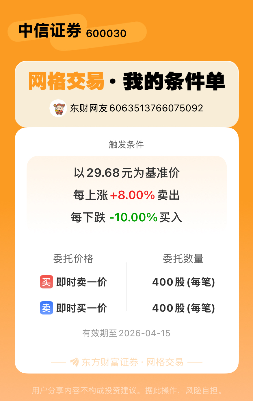 #条件单交流# #网格交易晒单# 一位股神设置了一个网格交易条件单,接下来就是见证奇迹的时刻~$中信证券(SH600030)$