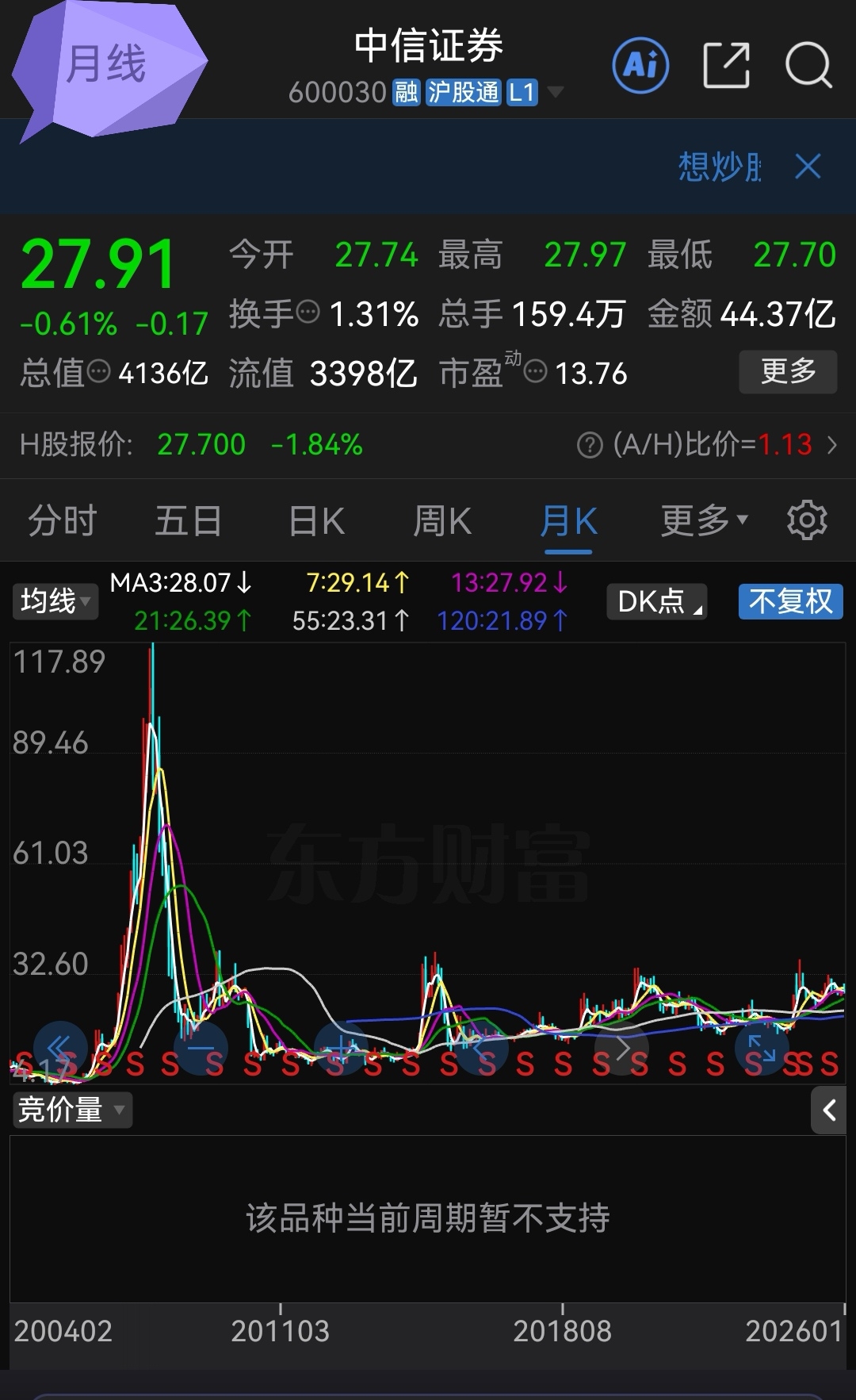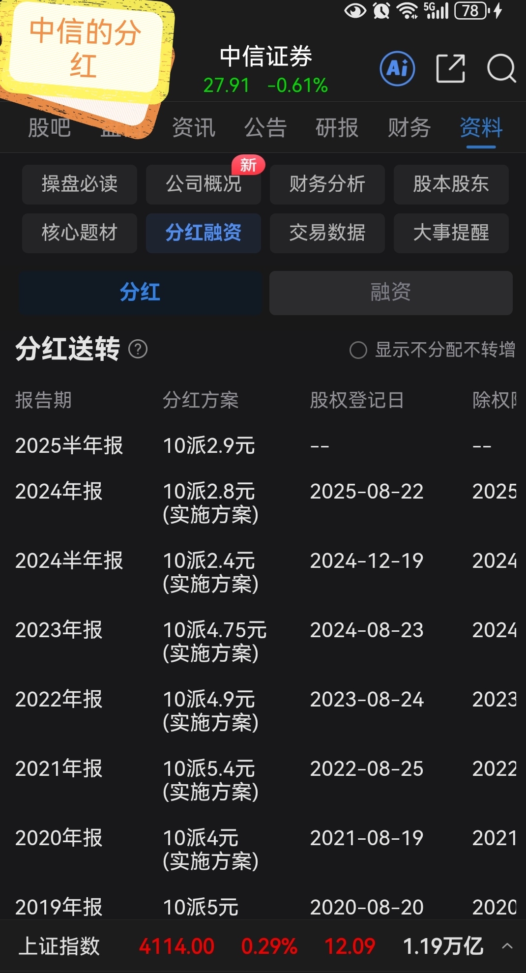 中信证券的分红。现在比以前好点,一年分红两次了。