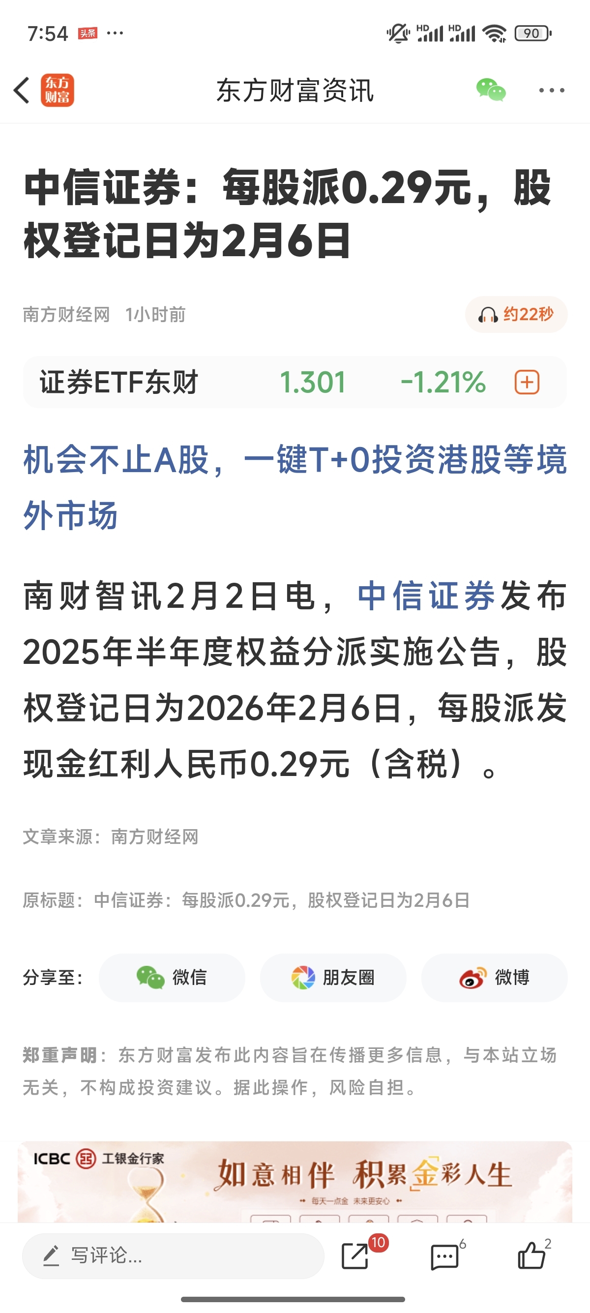 $中信证券(SH600030)$ 还是中信给力,分红来了,买你就是为了分红