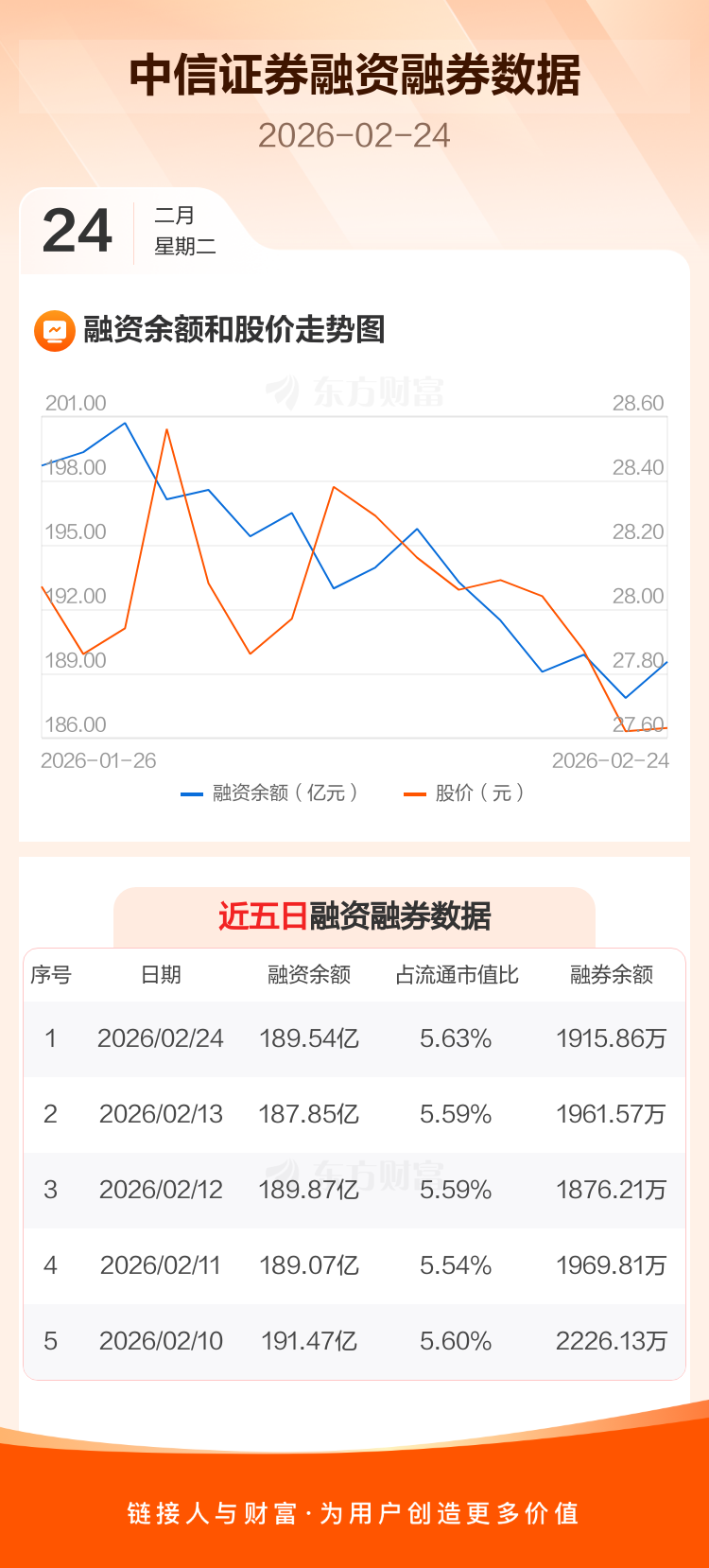 交易所最新数据显示,中信证券于2026年2月24日获融资买入3.91亿元,融资偿还2.22亿元,当日融资净买入1.69亿元。目前,该股融资余额189.54亿,占流通市值比例为5.63%。