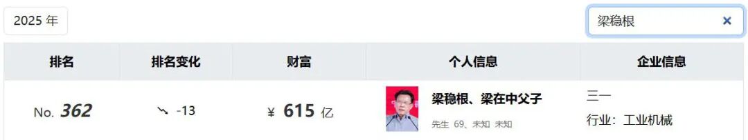 其中,三一重工卖工程机械,三一国际销售矿山装备,三一重能则专注风机制造。据《2025胡润全球富豪榜》,梁稳根家族财富高达615亿元。