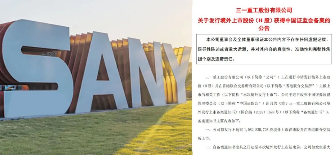 10月9日,其实控的三一重工,发布公告称,本次赴港上市,收到中国证监会出具的备案通知书,即业内俗称的路条。