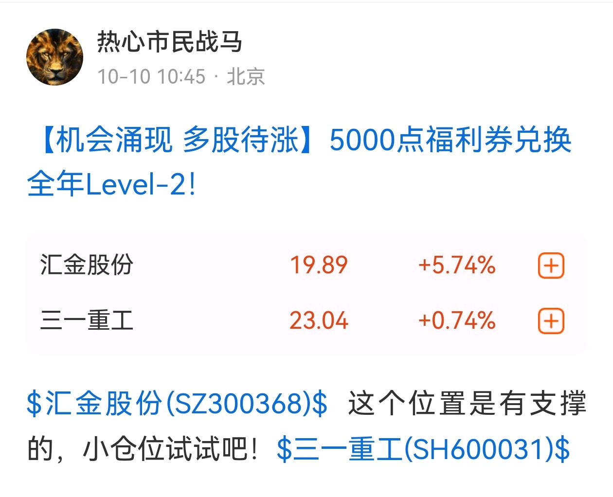 $三一重工(SH600031)$ $汇金股份(SZ300368)$ 不放量就耐心拿好,昨天就说了,不要怕价格高,一切以趋势为主!即使放量了跑也不迟。